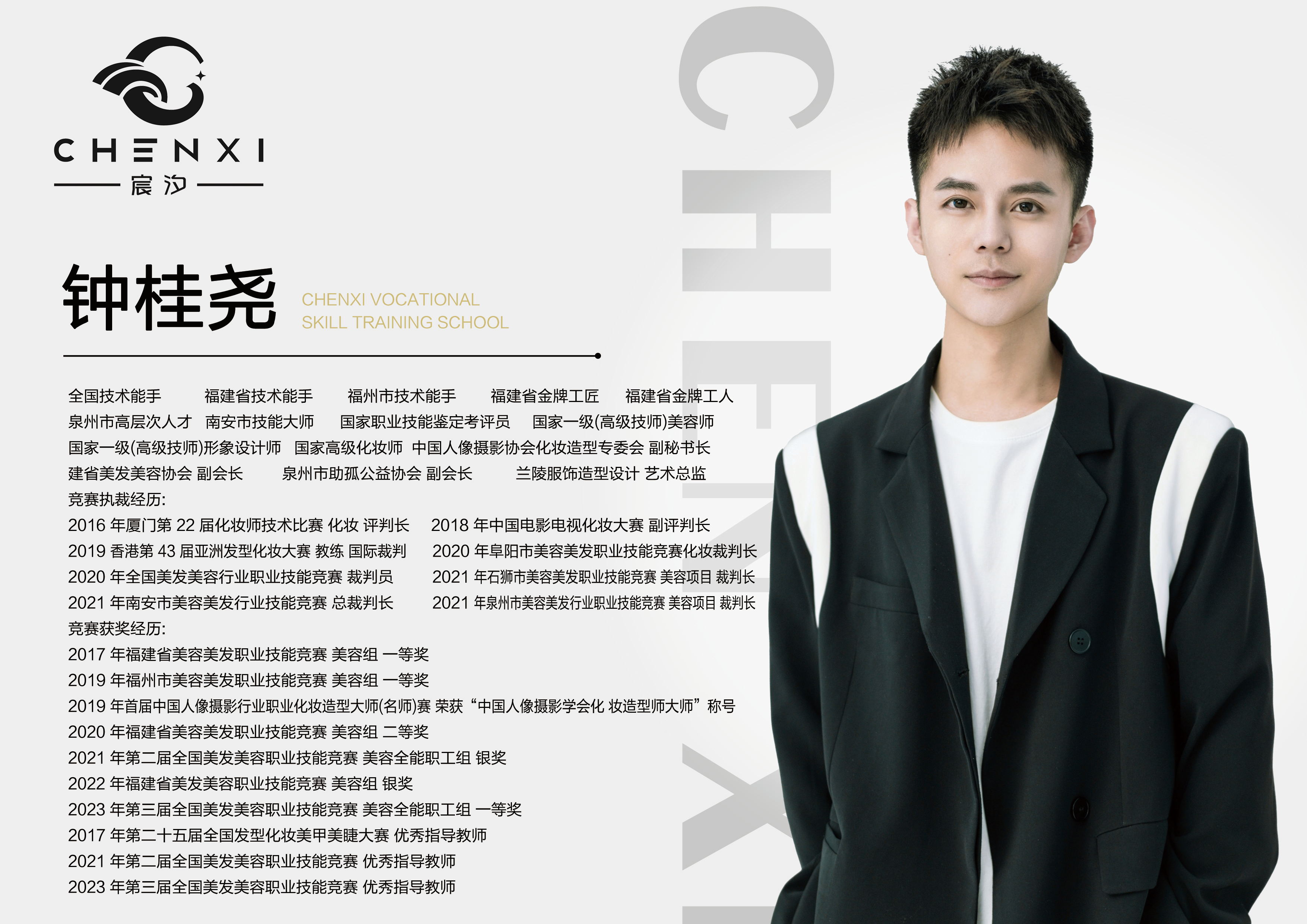 钟桂尧,男,福建长汀人,两项专业国家一级/高级技师(美容师、形象设计师),国家职业技能鉴定考评员,国家职业技能竞赛裁判员,曾获得“全国技术能手,福建省技术能手,福建省金牌工匠,福建省金牌工人,福建省高层次C类人才,泉州市高层次人才,南安市技能大师”等荣誉称号。现为兰陵服饰造型设计艺术总监、宸汐职业技能培训学校教育总监。